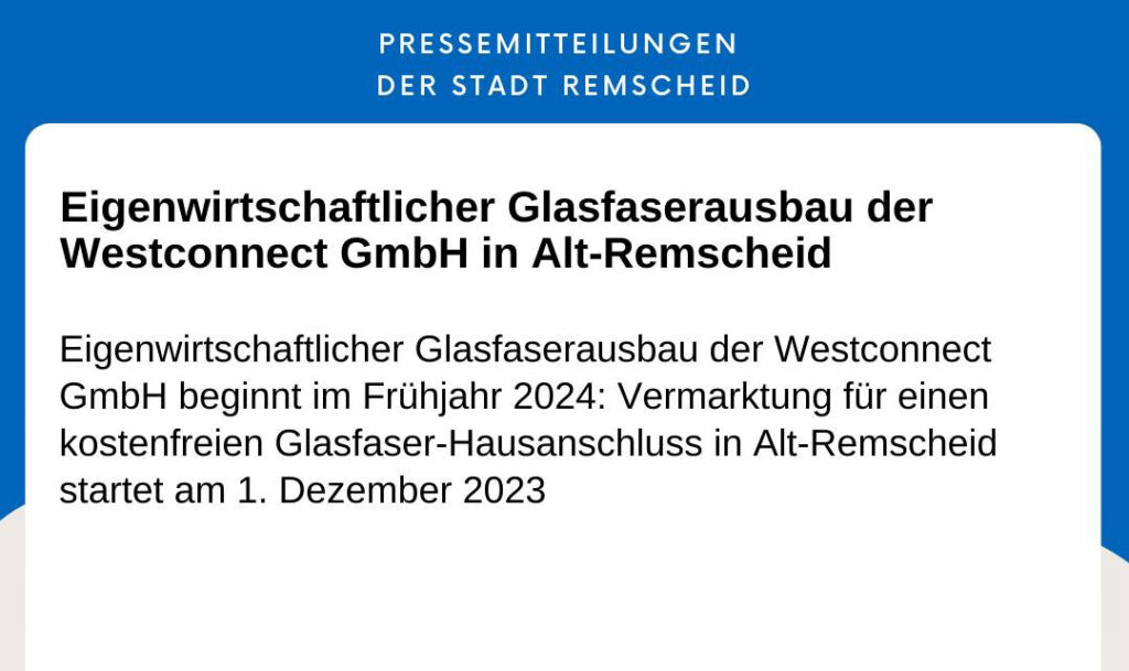 In einer Pressemitteilung informiert die Stadt Remscheid darüber, dass eine Firma abseits der Telekom den Glasfaserausbau in Alt Remscheid übernehmen wird.